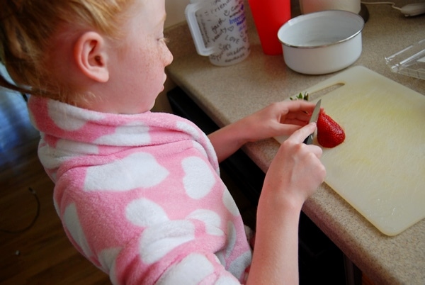 Sunday morning we woke up early to prepare dad’s breakfast. Elle cut strawberries.