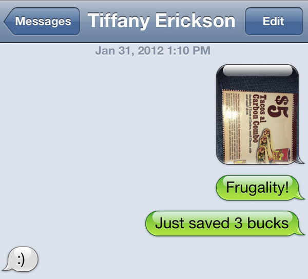 Now for those of you worried that Chad is controlled by me or that he is forced to do my ideas– don’t you worry. Me controlling him is almost laughable. That guy does whatever the heck he wants. But judging from this text I got from him the other day, I think he is using and maybe even enjoying his new coupon book.