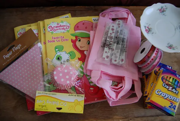 For example, Croft and I decided awhile ago to do a Strawberry Shortcake party for her birthday in December so I have been gathering items for the party for the last 6 months. I found some old ribbon I had that matched the party colors. I picked up SS coloring books when I saw them for $1. I picked up crayons at the back to school sales. I found mini pink totes in the Target dollar bins this summer that will work great for the take home party favors. I’ve already canned jars of strawberry jam when strawberries were $5.99 a case. And I I found a cute pink polka dot banner and cupcake holders at Partyland. I am watching for red felt to go on sale at Hobby Lobby so I can embellish the banner and totes with strawberries. Every time I go to an antique store I look for little plates to make into cupcake holders.