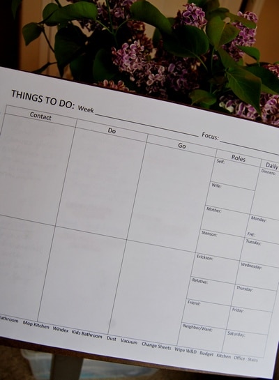 Perhaps my favorite section on my “Things To Do” list is the “Roles” column. It helps me keep in mind what is most important and serves as a reminder of who I need to be helping. I look for ways throughout the week to do something in each of my roles. It is the one section that I try to fill in if it is blank.