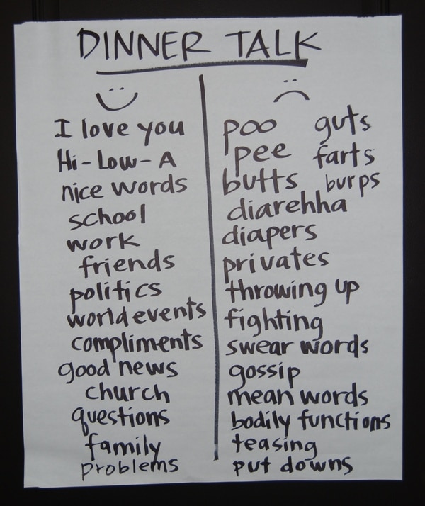 We made a T-chart of things that are good to talk about at dinner and things that are not. The kids mentioned it was okay to talk about school, good news, compliments, work, family and friends. It is not okay to talk about any bodily function or bodily product. I also don’t think dinner should be a place to pass gossip and bash on neighbors, teachers, leaders or anyone for that matter.
